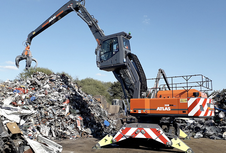 The Atlas 350MH material handler weighs in at 36 ton and offers a max range of 18.2 meters with a cab raise height of 2.7m and is available with a 600 – 700 litre scrap grab.