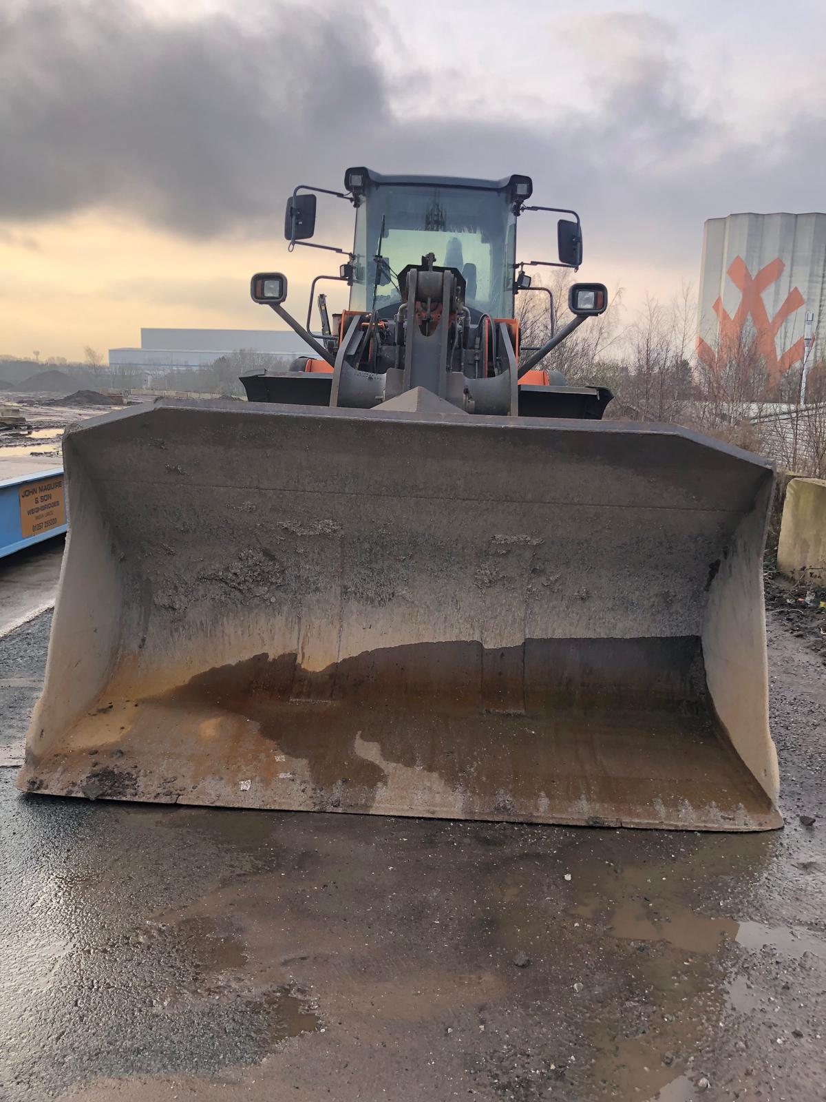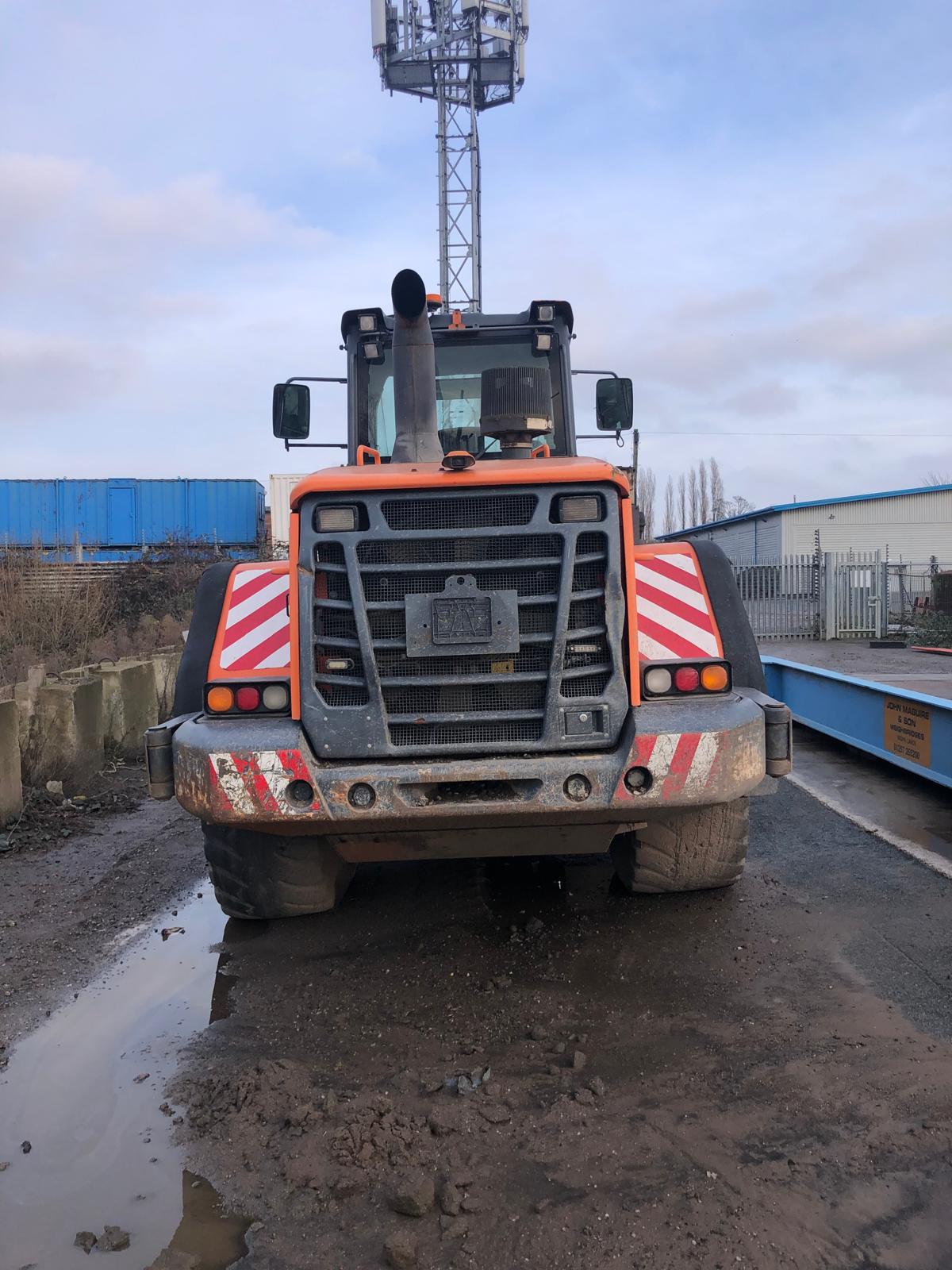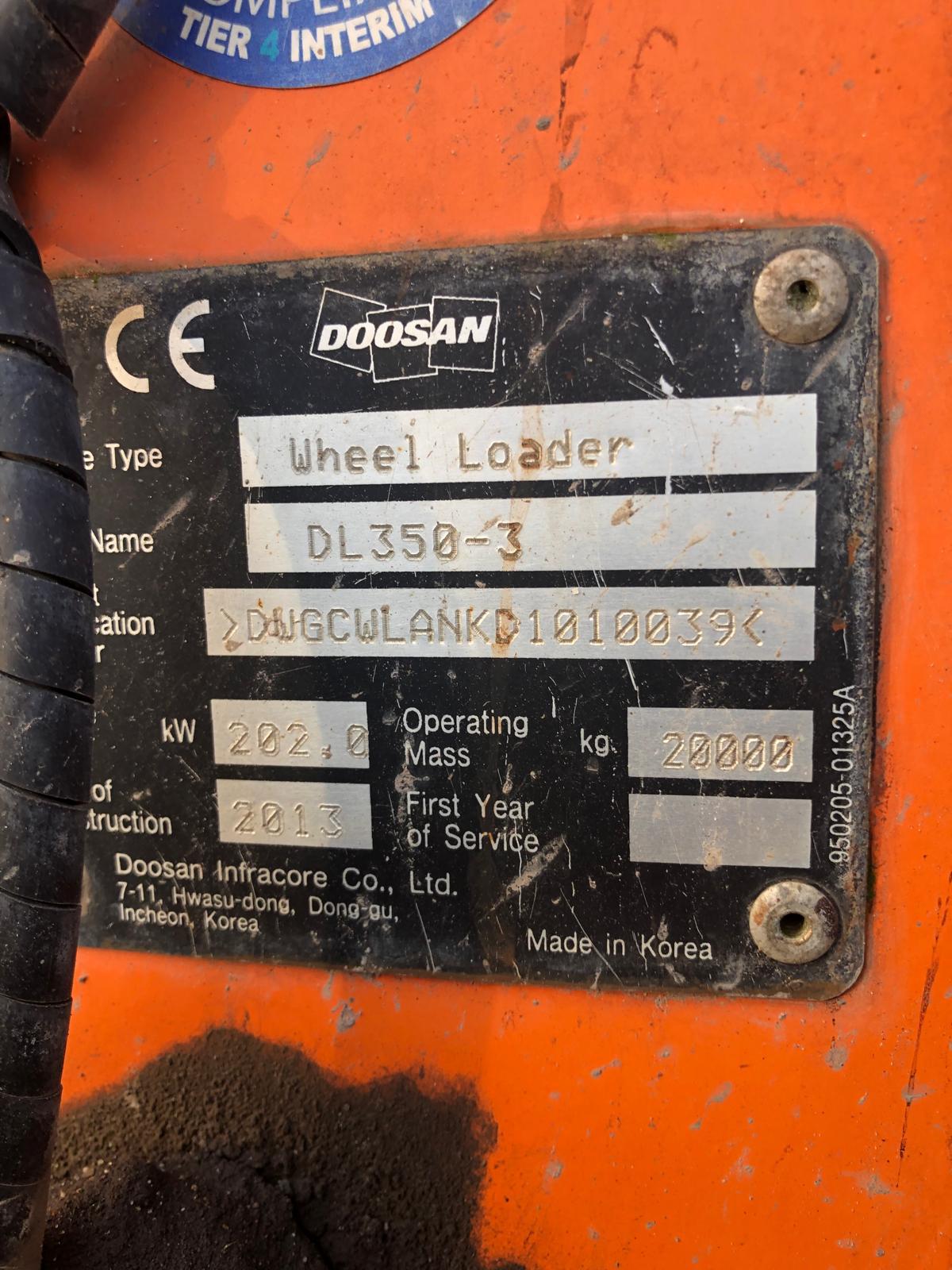 Doosan DL350-3 Wheel Loader, year 2013, 8,053.6 hours. This heavy-duty wheel loader delivers strong breakout force, fast cycle times, and excellent operator comfort — ideal for quarrying, construction, and bulk material handling.
